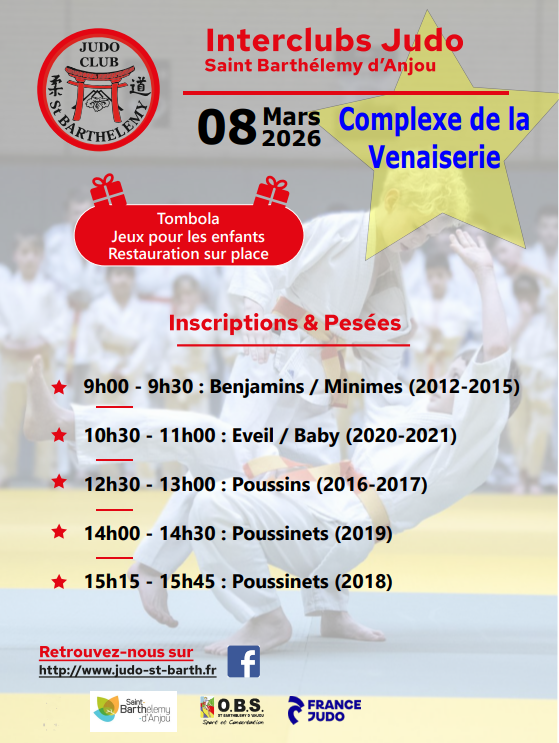 9h00 - 9h30 : Benjamins / Minimes (2012-2015) 10h30 - 11h00 : Eveil / Baby (2020-2021) 12h30 - 13h00 : Poussins (2016-2017) 14h00 - 14h30 : Poussinets (2019) 15h15 - 15h45 : Poussinets (2018)